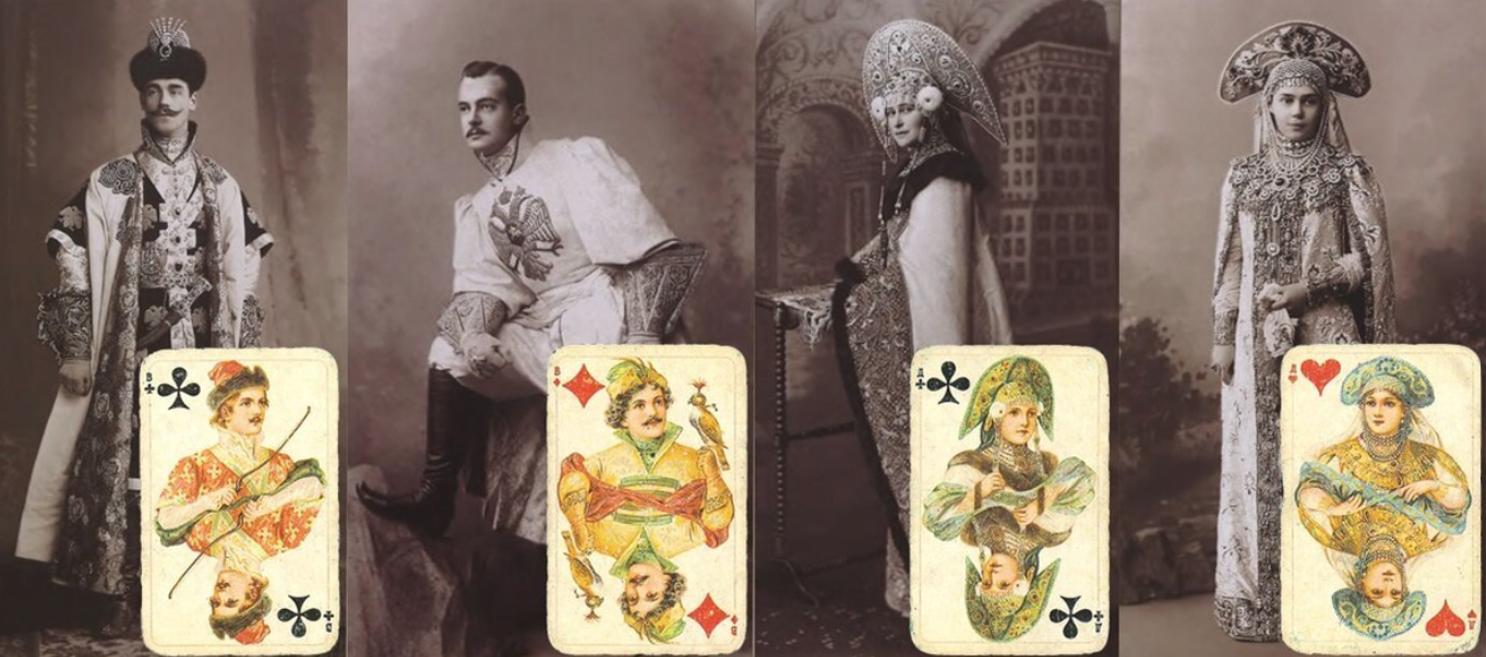 Червовой дамой оказалась княгиня Ксения Александровна — старшая сестра императрицы, на карте она изображена в костюме русской барыни начала семнадцатого века. Трефовой дамой стала графиня Сумарокова-Эльстон, а бубновой — ее сестра Зинаида Юсупова. Бубновой дамой была графиня Александра Толстая. Трефовым валетом оказался младший брат императора — великий князь Михаил Александрович. Бубновым — еще один младший Романов — князь Андрей Владимирович. Николай Волков, адъютант генерал-адмирала Алексея Александровича, стал валетом червовым. Валет пик — это молодой генерал Александр Николаевич Безак. Статский императорский советник Николай Гартунг оказался картой бубнового короля. Трефового короля срисовали с графа Михаила Граббе. Прообразом короля червового стал император Николай II. Император был одет в костюм, который точно повторял выходной наряд царя Алексея Михайловича. Во время маскарада император позировал с царским золотым посохом, привезенным из Оружейной палаты.