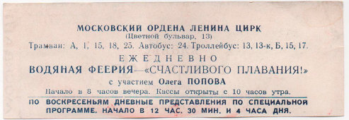 Советский билет в цирк на представление «Водяная феерия» с участием клоуна Олега Попова, Москва, 1959 г.Артикул: 14672 Цена: 2 500 руб.
