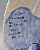 На лицевой стороне на борте тарелки строки: «Кому камень под силу свернуть, тому богатому быть». На оборотной стороне подпись автора.