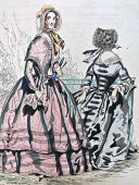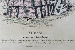 Старинная гравюра в паспарту «Французская женская мода. Наряды для прогулки» из журнала La Mode,