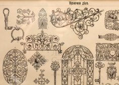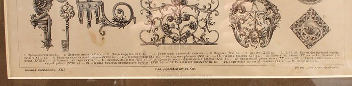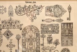 На гравюре представлены различные предметы кузнечного ремесла: дверные петли, поручни и ручки, замки и ключи, светильники, решетки, крышка для ларя и другие.