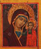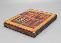 Старинная четырехчастная икона «Богородицы Одигитрия и Казанская, святые Михаил Клопский, Александра и ростовские чудотворцы», Россия, 2-я пол. 19 в.Артикул: 16956 Нет в наличии
