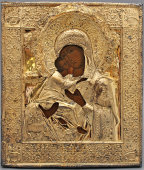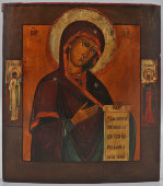 Старинная деревянная икона Божией Матери «Богородица Боголюбская со святыми на полях: Ангел Хранитель и муч. Васса», Россия, 2-я пол. 19 в.Артикул: 15638 Цена: 42 500 руб.