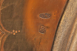 На каждом фрагменте оклада имеются пробирные клейма: ПП - мастер Петров Петр Петрович, владелец серебряных мастерских в Москве (1908-1917 гг.); клеймо пробирного управления (1899-1908 гг.) - в овале женская головка, повернутая налево, перед ней проба 84 за головкой вертикальные буквы ЛЛ(ИЛ).