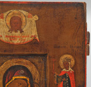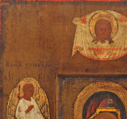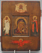 Старинная икона Богоматери Казанской с образами Ангела Хранителя, Св. Илинии, Спаса на убрусе и Св. Серафима в латунном позолоченном окладе, Россия, 19 в.Артикул: 17088 Цена: 580 000 руб.