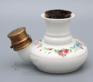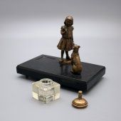 Стеклянная чернильница на мраморной подставке с композицией «Девочка дрессирует собаку»,