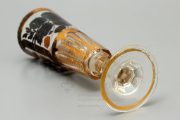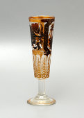Бокал конусовидной формы на ножке-столбике с круглым гладким основанием изготовлен из прозрачного бесцветного стекла методом выдувания. Верхняя часть корпуса декорирована ландшафтной композицией с фигуркой «китайца», помещённой в восьмиугольный резерв. На противоположной стороне изображена ветка с крупными цветами и листьями. Нижняя часть корпуса отшлифована девятью узкими ветками с узкими листьями. Роспись выполнена золотом и серебром. По краю слива положена отводка золотом. Стойка ножки отшлифована восеьмью узкими гранями.