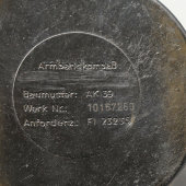 На оборотной стороне маркировка: «Armbandkompass, Baumuster AK39, Werk Nr: 10157260, Antorderz F1 232335».