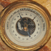 Барометр-анероид — это механический прибор для измерения атмосферного давления. Его основная часть — металлическая гофрированная коробка с вакуумом внутри, которая сжимается при повышении давления и расширяется при его снижении. Эти изменения передаются через систему рычагов на стрелку, которая показывает значение давления на циферблате. Благодаря своей конструкции он точен и удобен, широко используется для прогноза погоды и в быту. Название «анероид» буквально означает «без воды» — устройство измеряет давление без жидкостей, что делает его безопаснее и компактнее по сравнению с ртутными барометрами. Прибор украшен эффектной бронзовой скульптурой орла с расправленными крыльями. Орёл — символ силы, власти и стремления к высотам; выполнен в технике бронзового литья с выразительной детализацией. Подобные барометры не только служили точными приборами для прогноза погоды, но и являлись престижными украшениями интерьера — символизировали статус, вкус и стремление владельца к изысканности.
