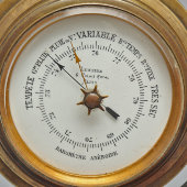 Барометр-анероид — это механический прибор для измерения атмосферного давления. Его основная часть — металлическая гофрированная коробка с вакуумом внутри, которая сжимается при повышении давления и расширяется при его снижении. Эти изменения передаются через систему рычагов на стрелку, которая показывает значение давления на циферблате. Благодаря своей конструкции он точен и удобен, широко используется для прогноза погоды и в быту. Название «анероид» буквально означает «без воды» — устройство измеряет давление без жидкостей, что делает его безопаснее и компактнее по сравнению с ртутными барометрами.